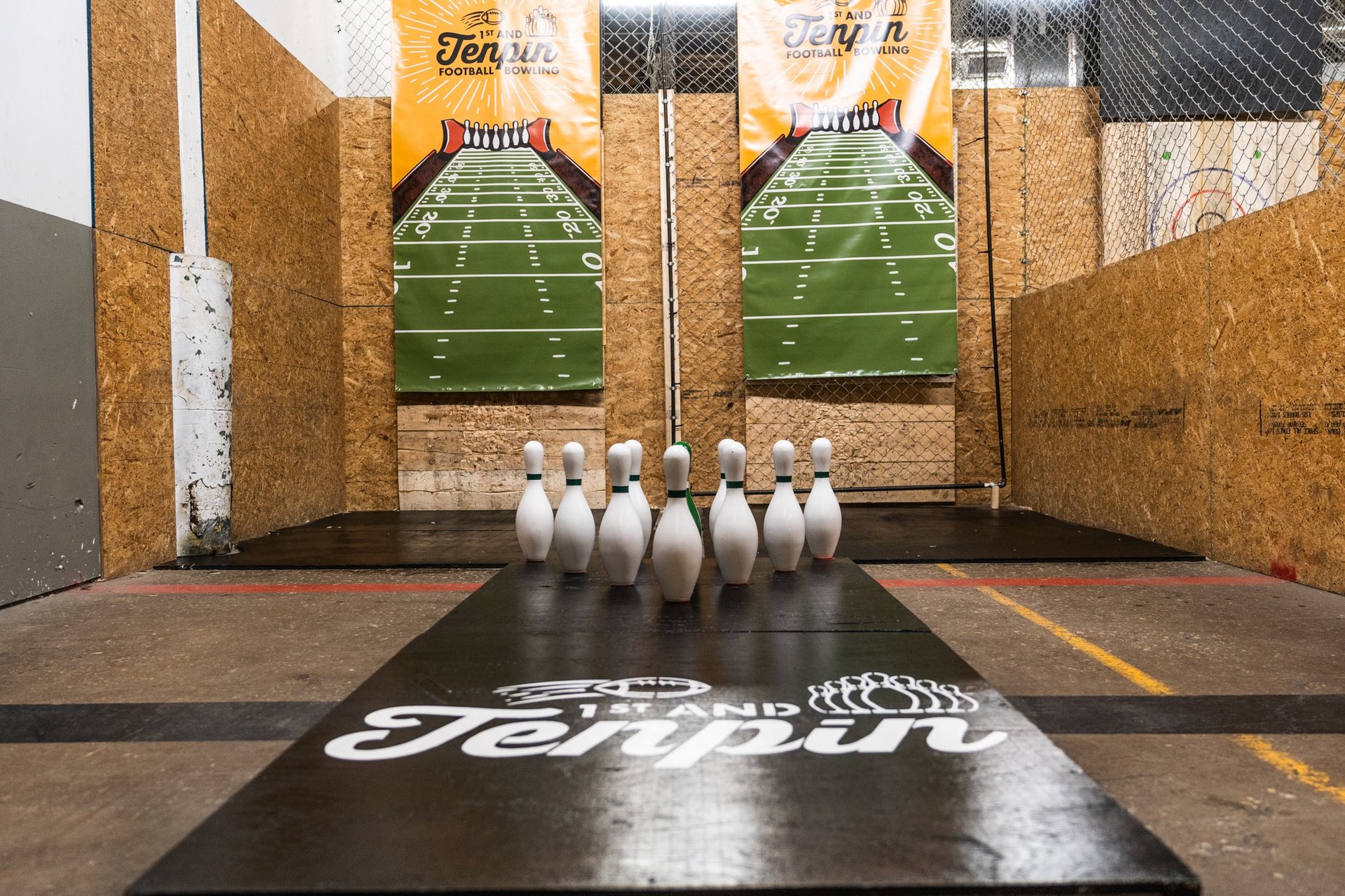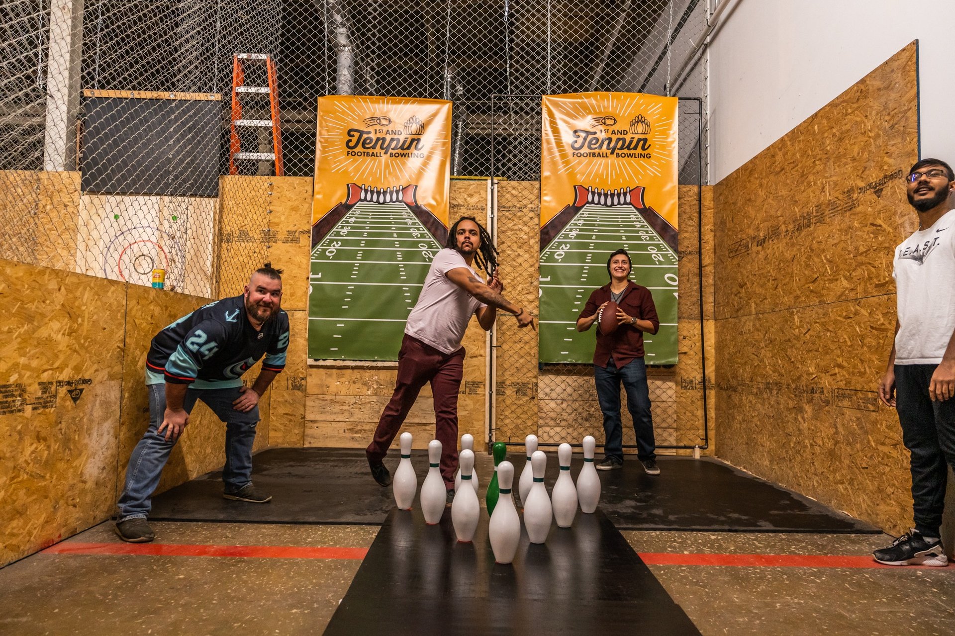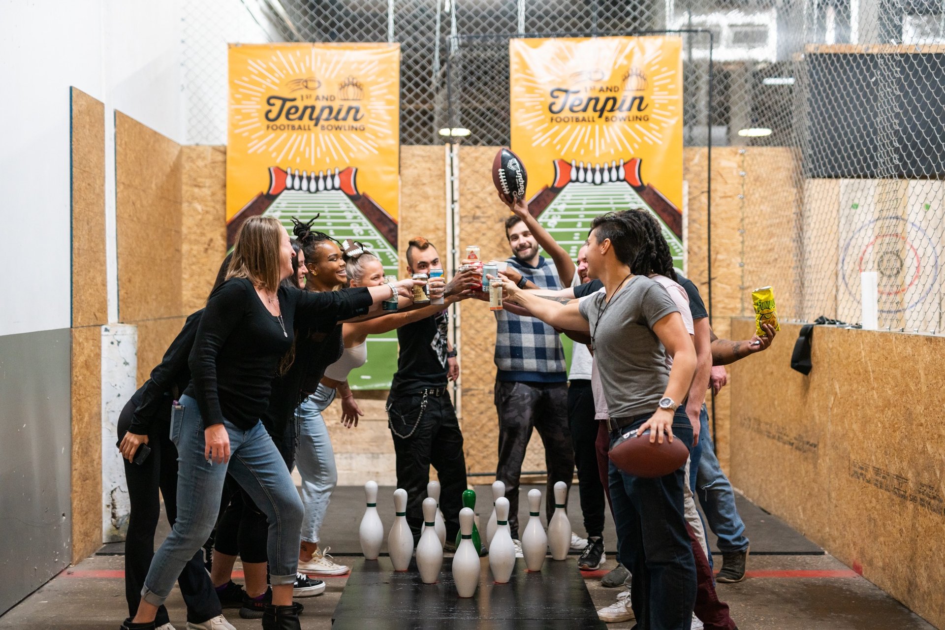 Football bowling is the best of both sports: throwing a football without the running and getting tackled, and bowling without the heavy balls and weird shoes. Located inside Urban Axes, 1st and Tenpin is the perfect location for your next birthday party, date night, team event or fun night out with friends. Grab some friends, a drink from our fully stocked bar (we are a 21+ facility), and get ready for an awesome time!